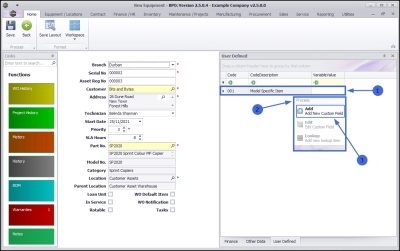 A User Defined panel has been added to the Asset Maintain screen - the Equipment Maintenance for Serial No: [] screen.