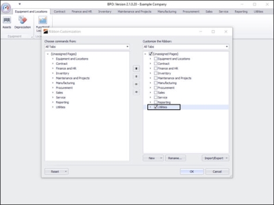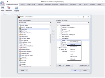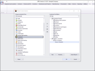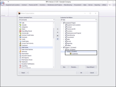 - The left-hand side of this screen is the Choose commands from: menu which contains a list of all the Tabs and Commands available in BPO2.