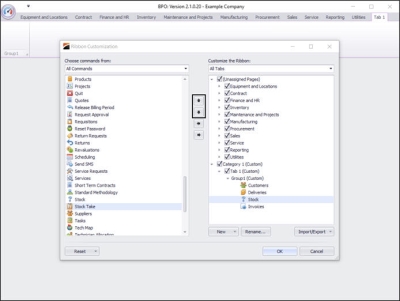 - In this image, the Stock and Invoices commands have also been added to Group 1.
