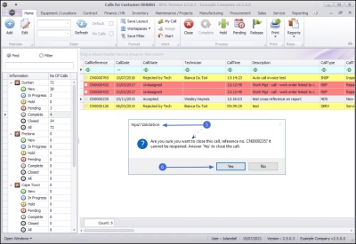 When a call has been closed, it cannot be re-opened, and can only be viewed. You will receive a notification when trying to close a Call that have outstanding items, such as billable items not yet invoiced, linked to the call.