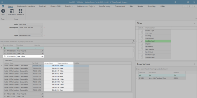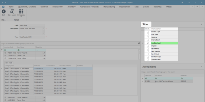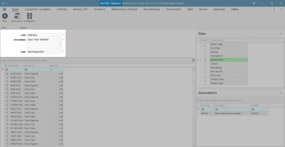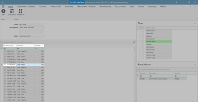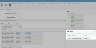 - On the right-hand side of the screen, the Associations docking panel lists the assets (machines/equipment items) that are linked to the BOM.
