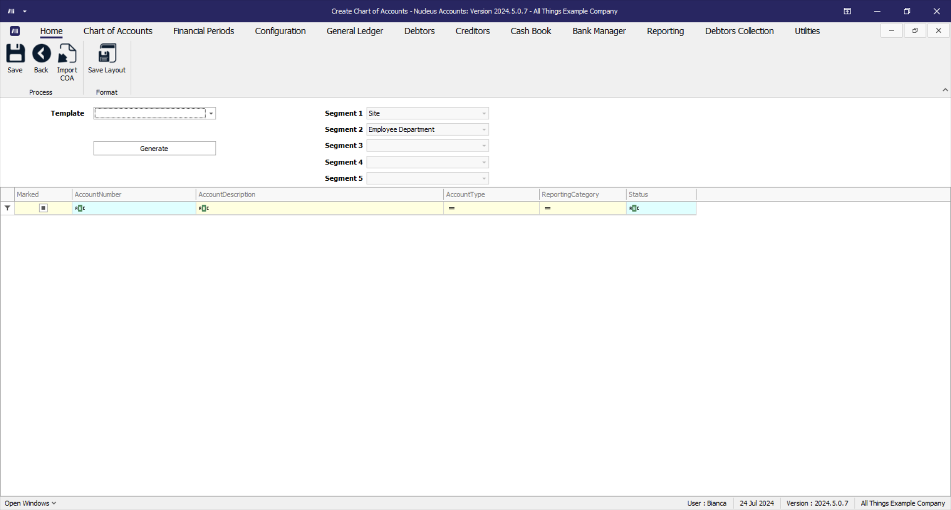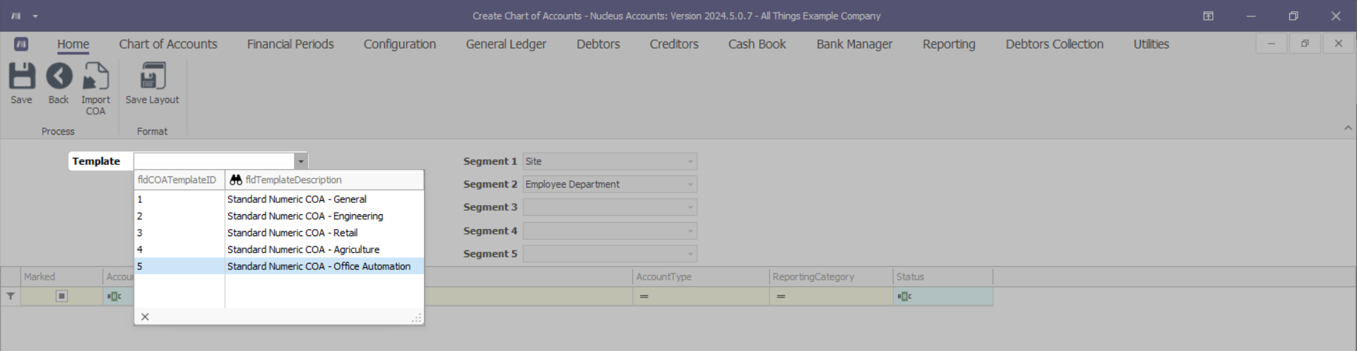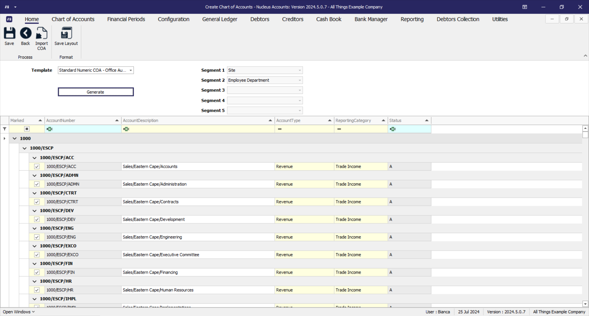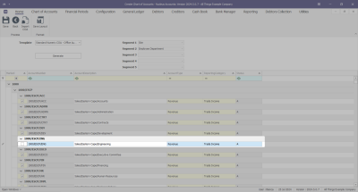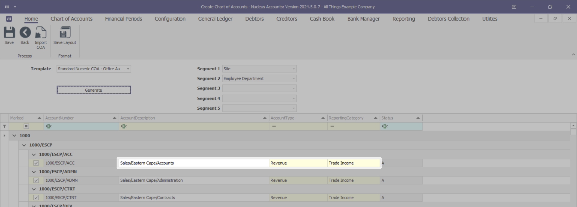 - The Marked column is used for Segmented Accounts.in the instance where you do not need all the segments that have been generated in this listing. For example, let us say that the Eastern Cape branch does not have an Engineering department - this account can be unselected and won't be added to the Chart of Accounts.