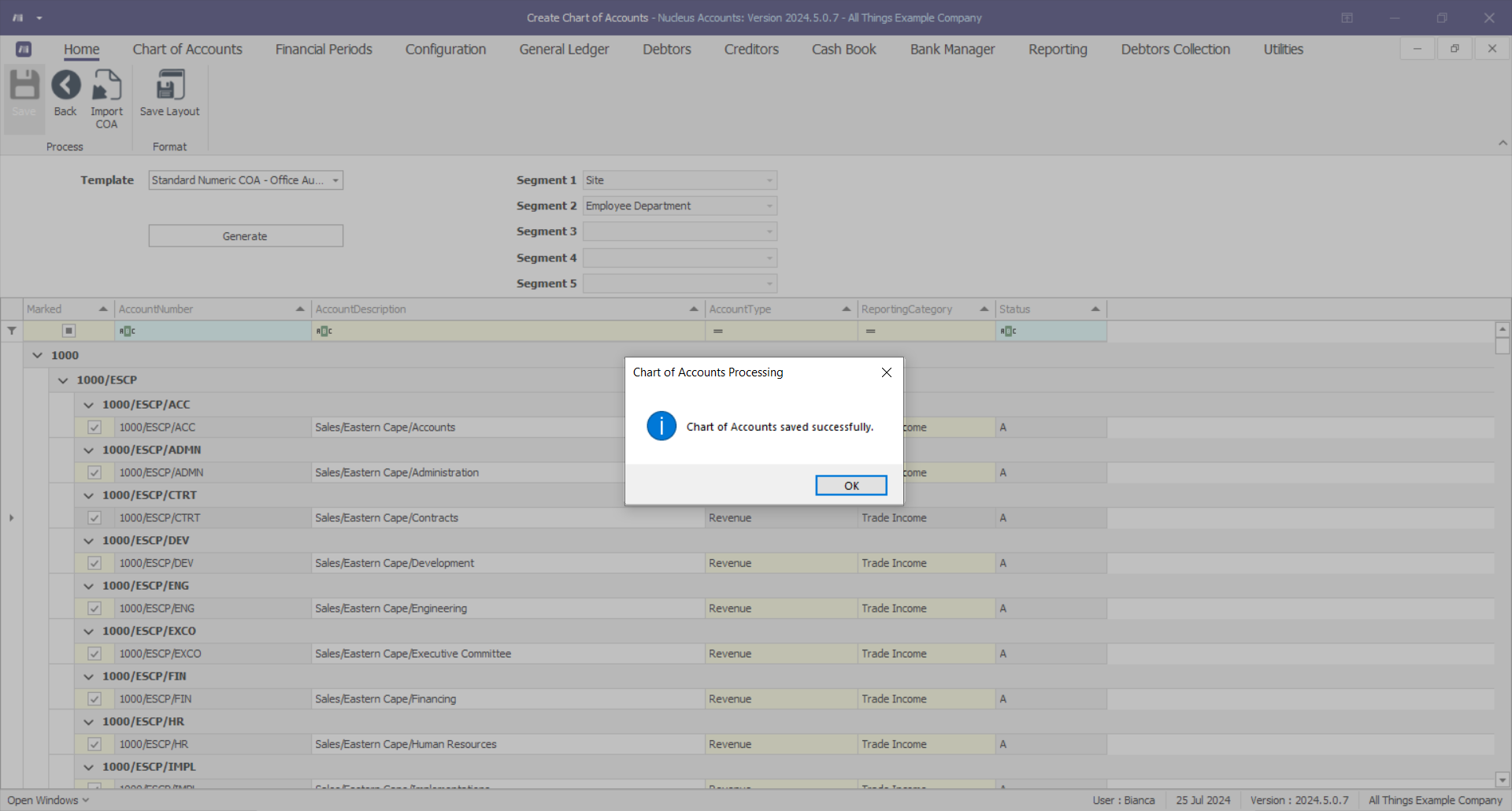- Once saved, a message box will come up stating; Chart of Accounts saved successfully.
