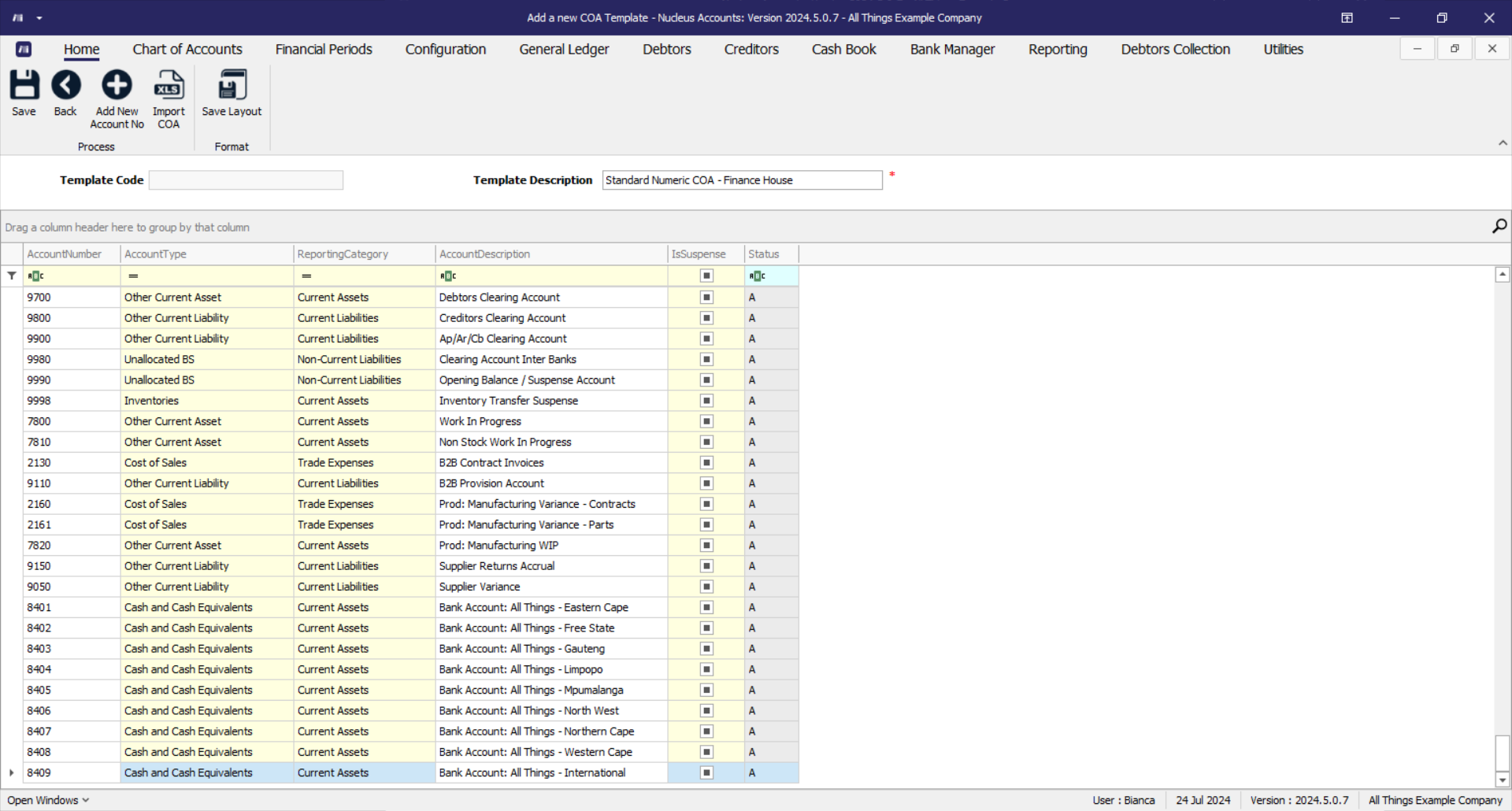 - All items from the selected file will populate in the Add new COA Template items data grid.