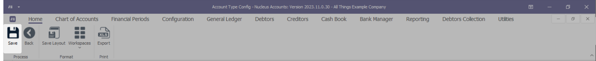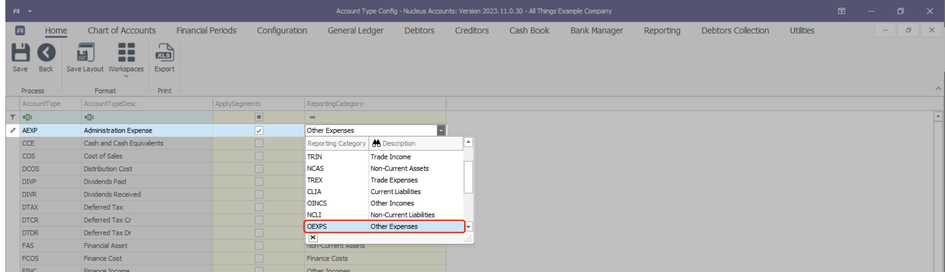 The Account Type Configuration screen in Nucleus Service lets you change the Reporting Category for each type of account. Additionally, it gives you the option to tag an account type for segmentation in the creation of a new chart of accounts.