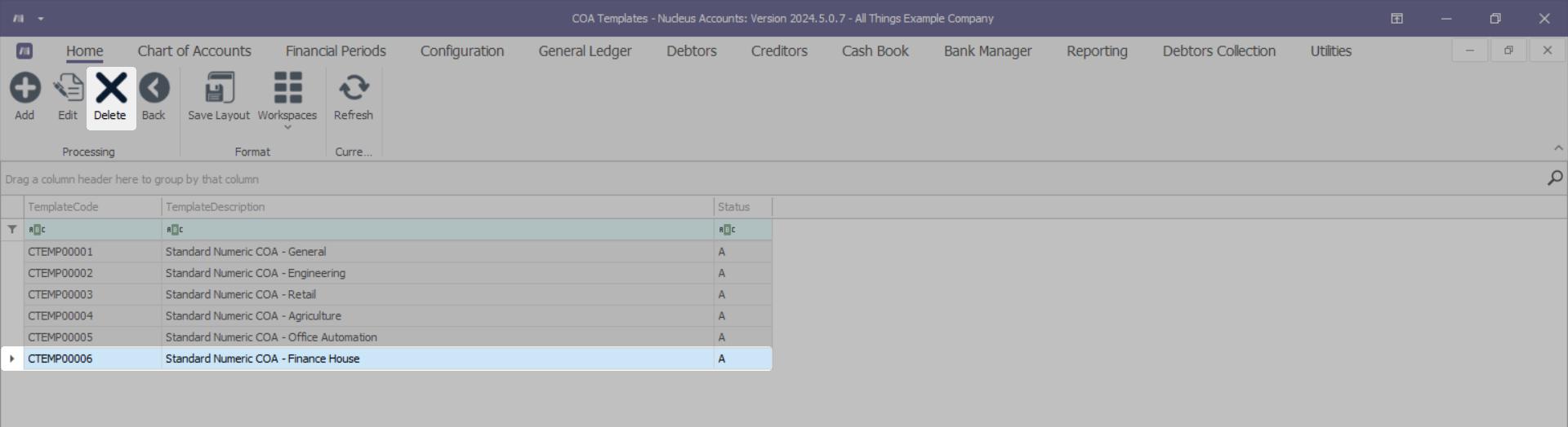 - Click on the row selector in front of the COA Template that you would like to Delete.