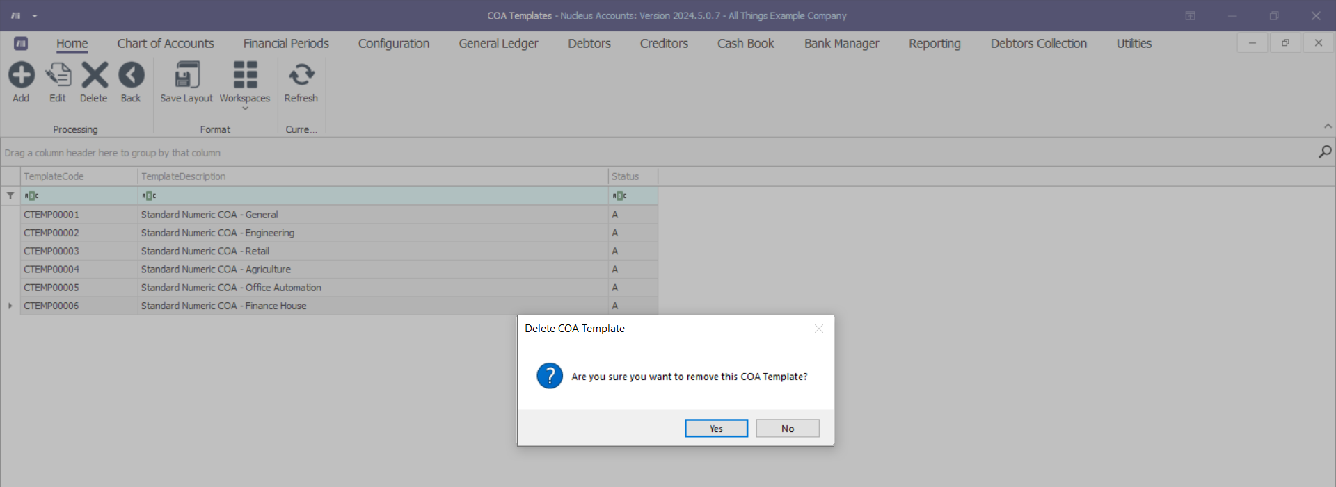 - A message box will come up asking; 'Are you sure you want to remove this COA Template?'