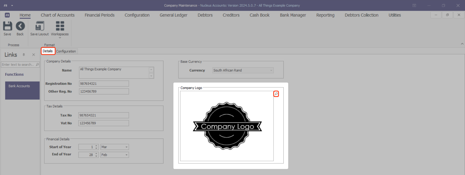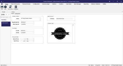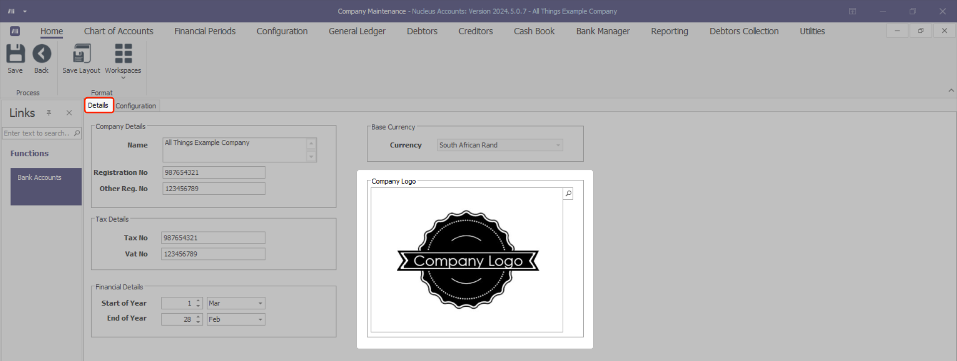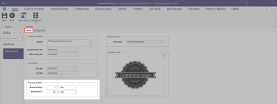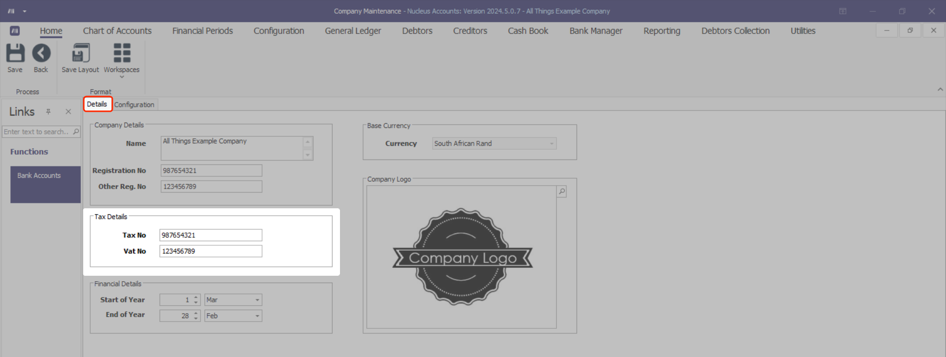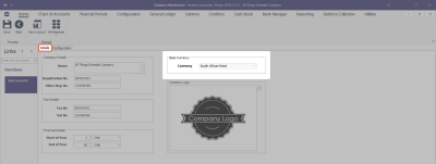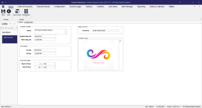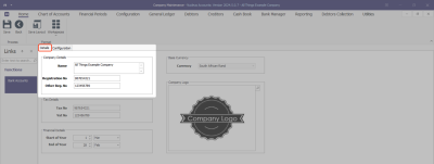Configuration of Company Details includes Company Details, Tax Details, Financial Details, Base Currency and Company Logo.