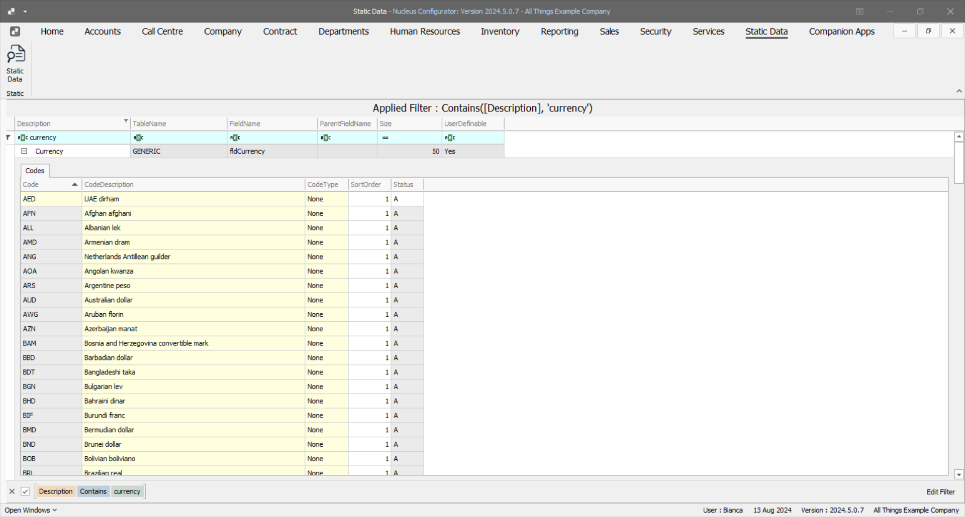 - These currency codes are set up in Nucleus Configurator > Static Data module.