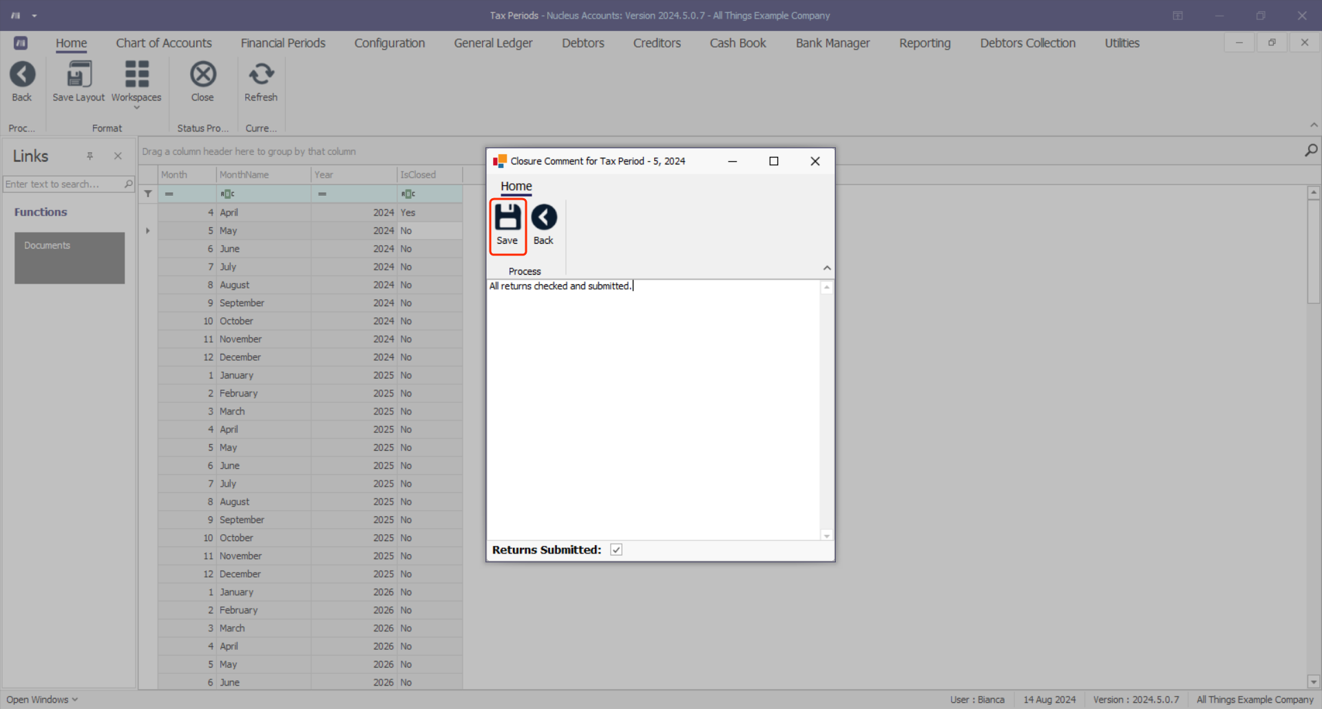 Note Tax periods do not need to be closed where configured to sync with the Financial Period.