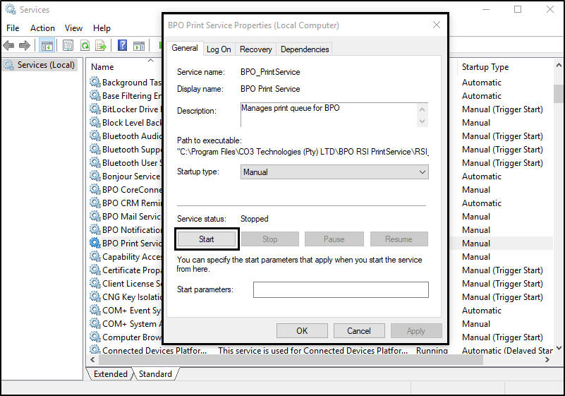 - Once the service has started successfully, the relevant Service Properties (Local Computer) pop up screen will appear.