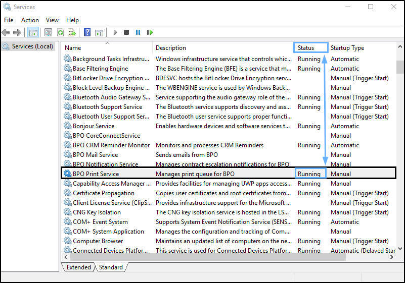 - In this image, BPO Print Service status is now displayed as Running.