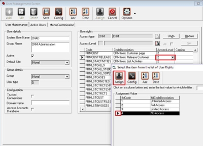 - Security can be set to either have Full Access or No Access to each of the forms in CRM, e.g. Customers, Contacts, Acitivites, Cases, 3rd Party, Pipeline and re-print Reports (Quotes, Orders, Invoices, Credit Notes and Contract Performance.