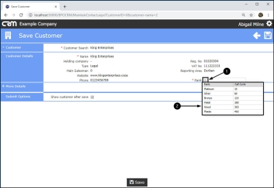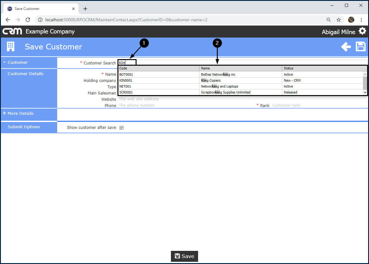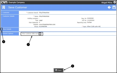 - If you do not tick this check box, when you click on Save, you will return to the CRM Dashboard home screen, and the newly entered customer details will not display.
