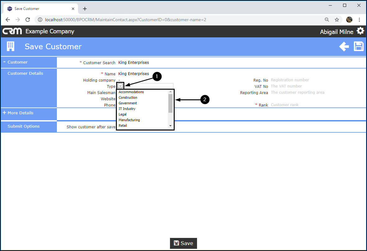 - Click on this arrow to display a list of company types (Manufacturing, Construction, Retail etc.) Scroll through this list to search for and select the relevant type.