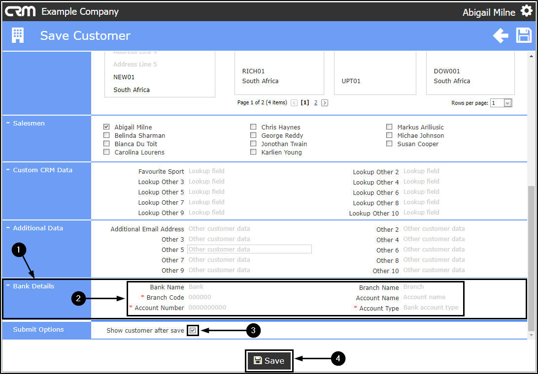 - When you have finished adding Salesmen if required, click on the expand icon in front of Custom CRM Data.