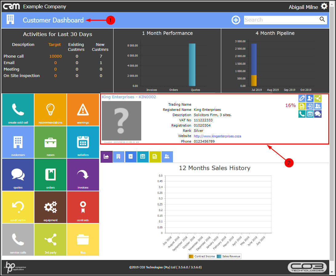 - If you did not select the Show customer after save check box, you will return to the CRM home screen Dashboard.