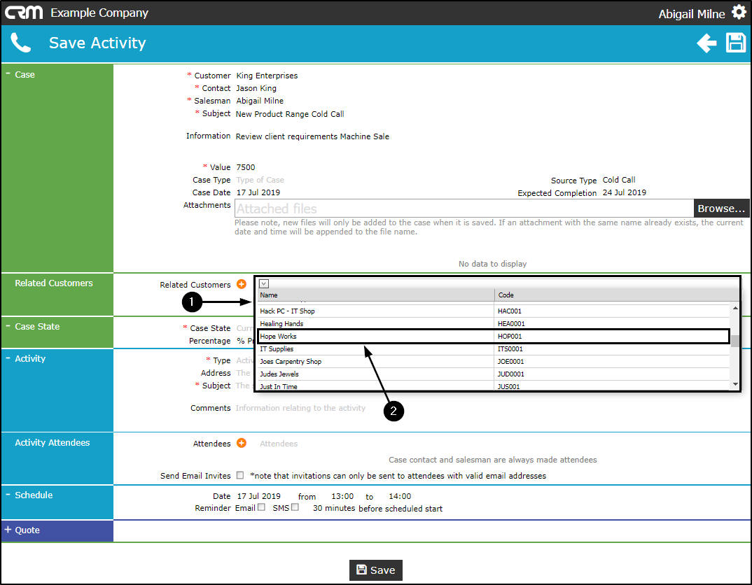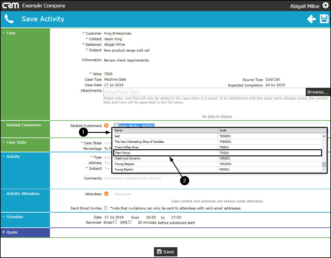 You can link a Related Customer, in order to invite contacts from various clients to an Activity - such as a meeting or training session.
