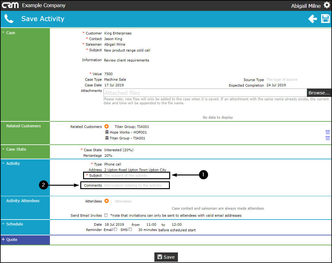 - Type in the Subject of this Activity (e.g. Phone call to discuss present client requirements and give overview of new product range).