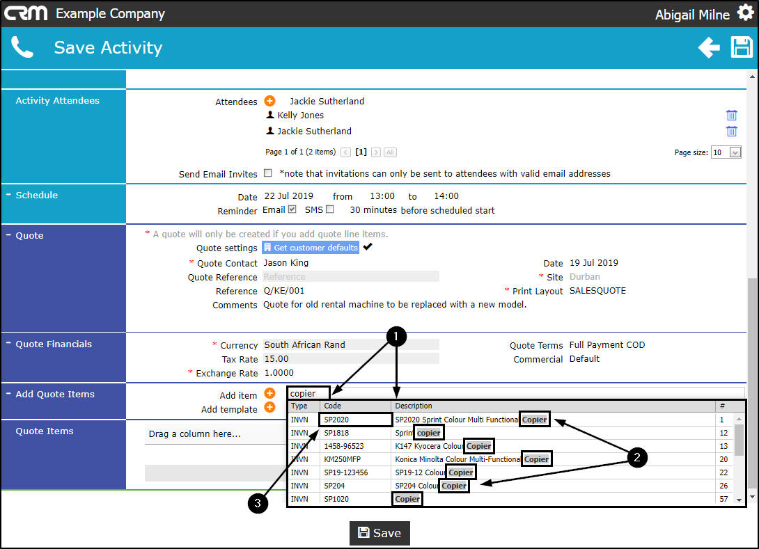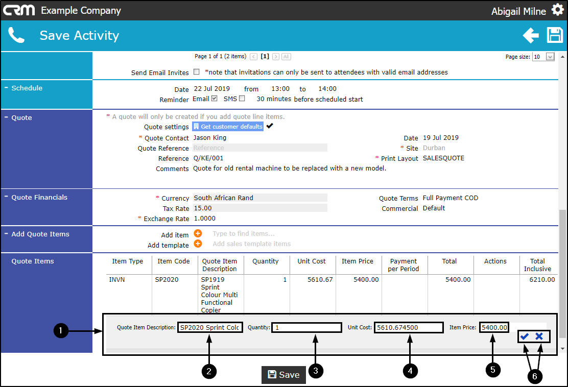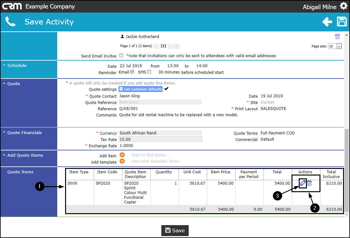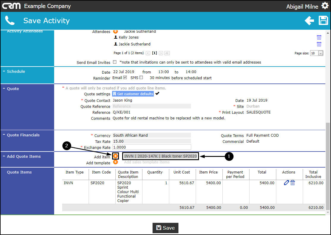 - When you have finished adding items to the Quote sections, click on Save.
