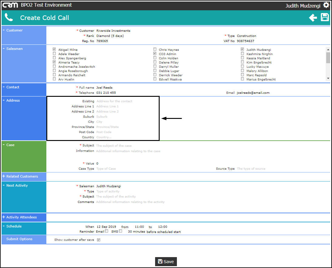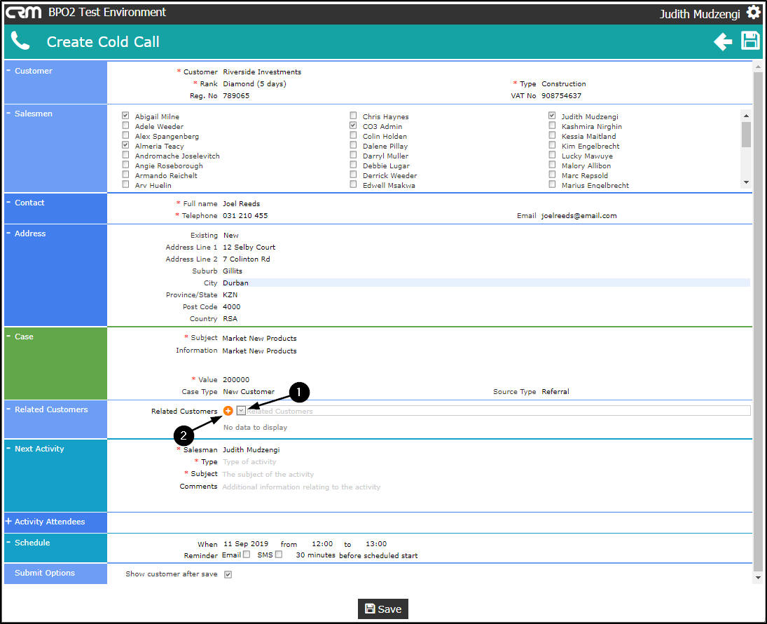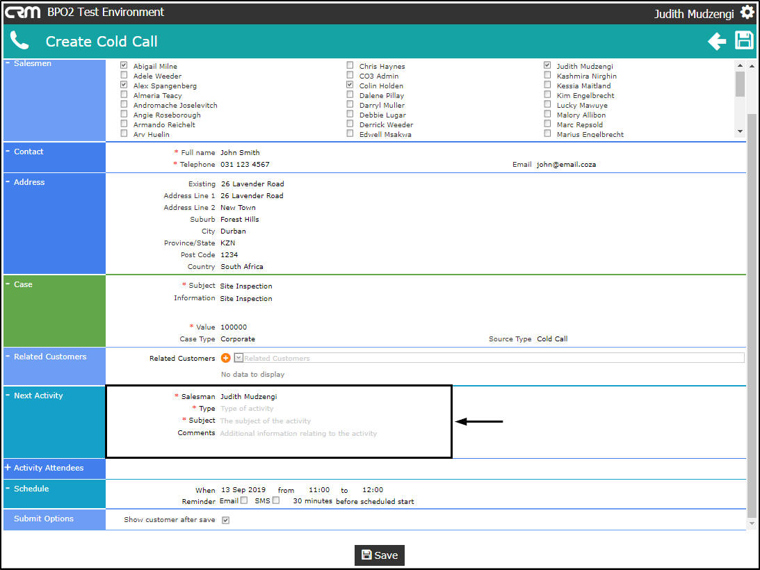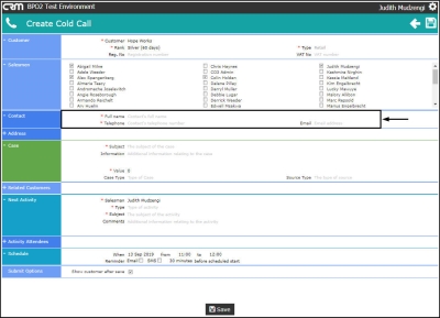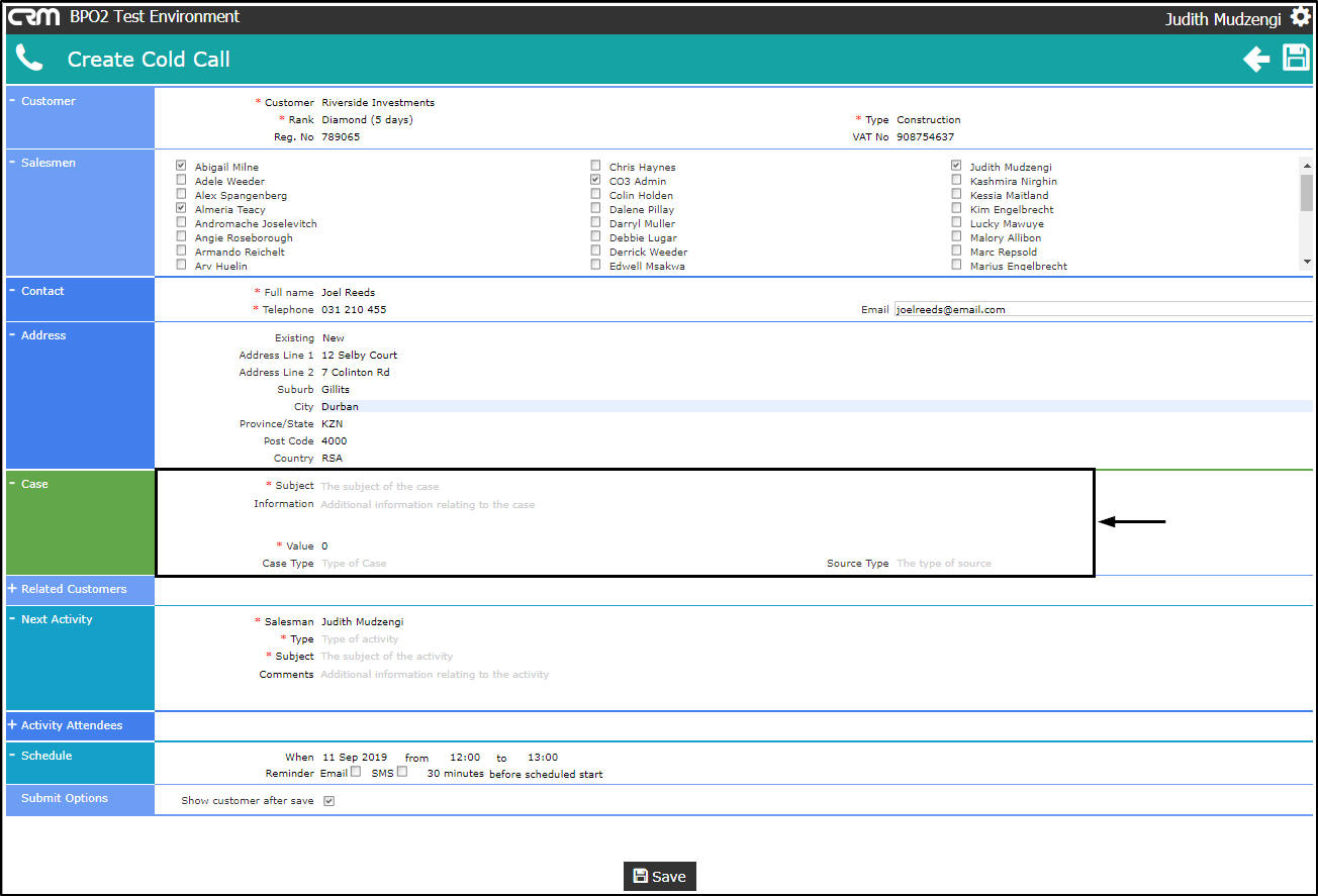 - Salesman: The person currently logged on to the system will be selected by default. You can assign this Customer, Case and Activity to another salesman, if you are raising this cold call on their behalf.