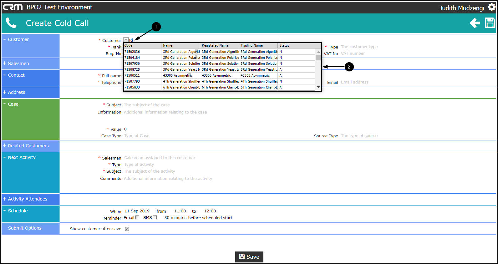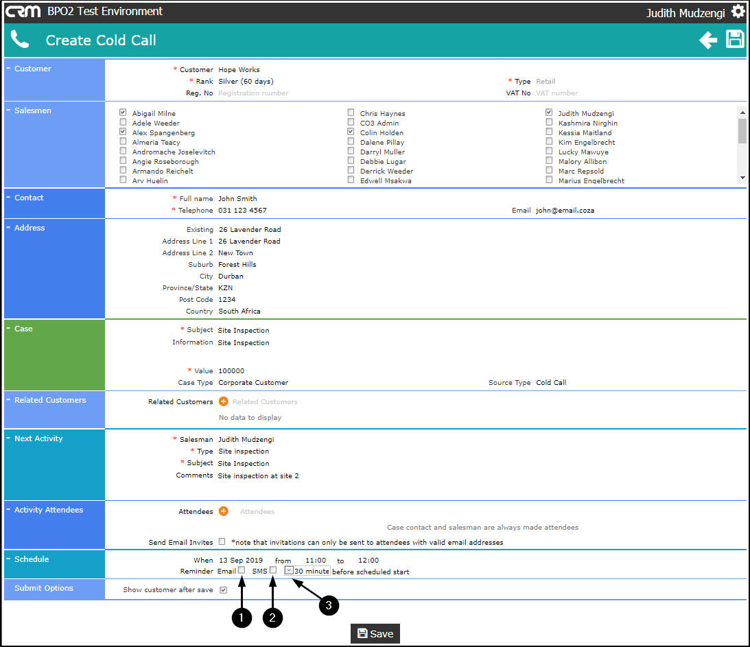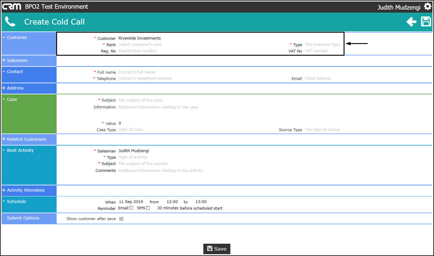- Salesman: The person currently logged on to the system will be selected by default. You can assign this Customer, Case and Activity to another salesman, if you are raising this cold call on their behalf.