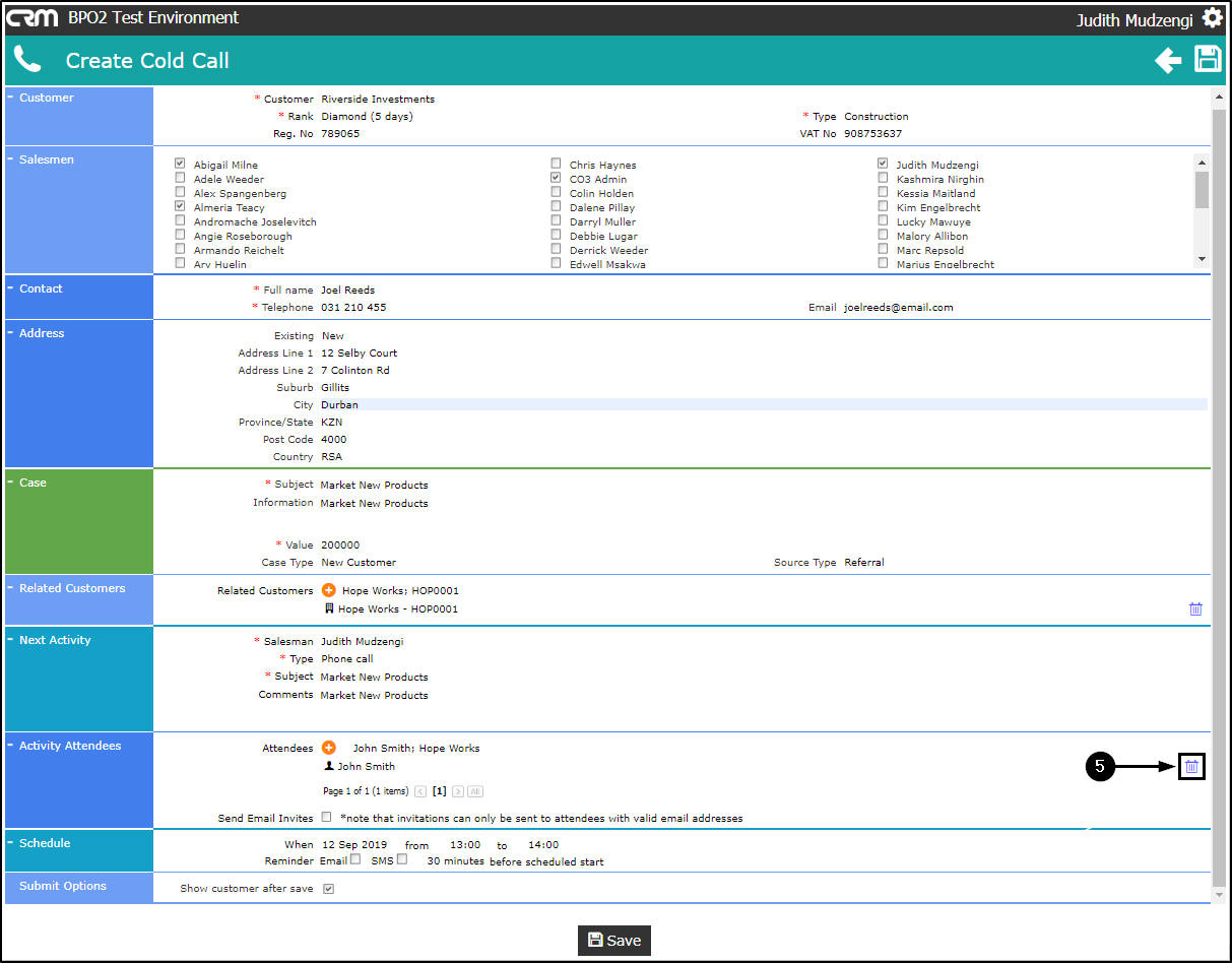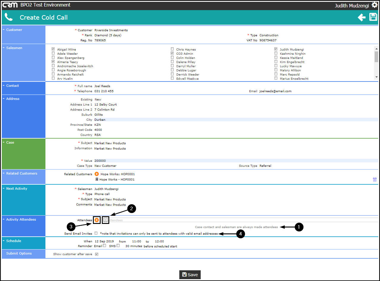 - The Salesman and Customer Contact will be linked as Activity Attendees by default (and cannot be removed).