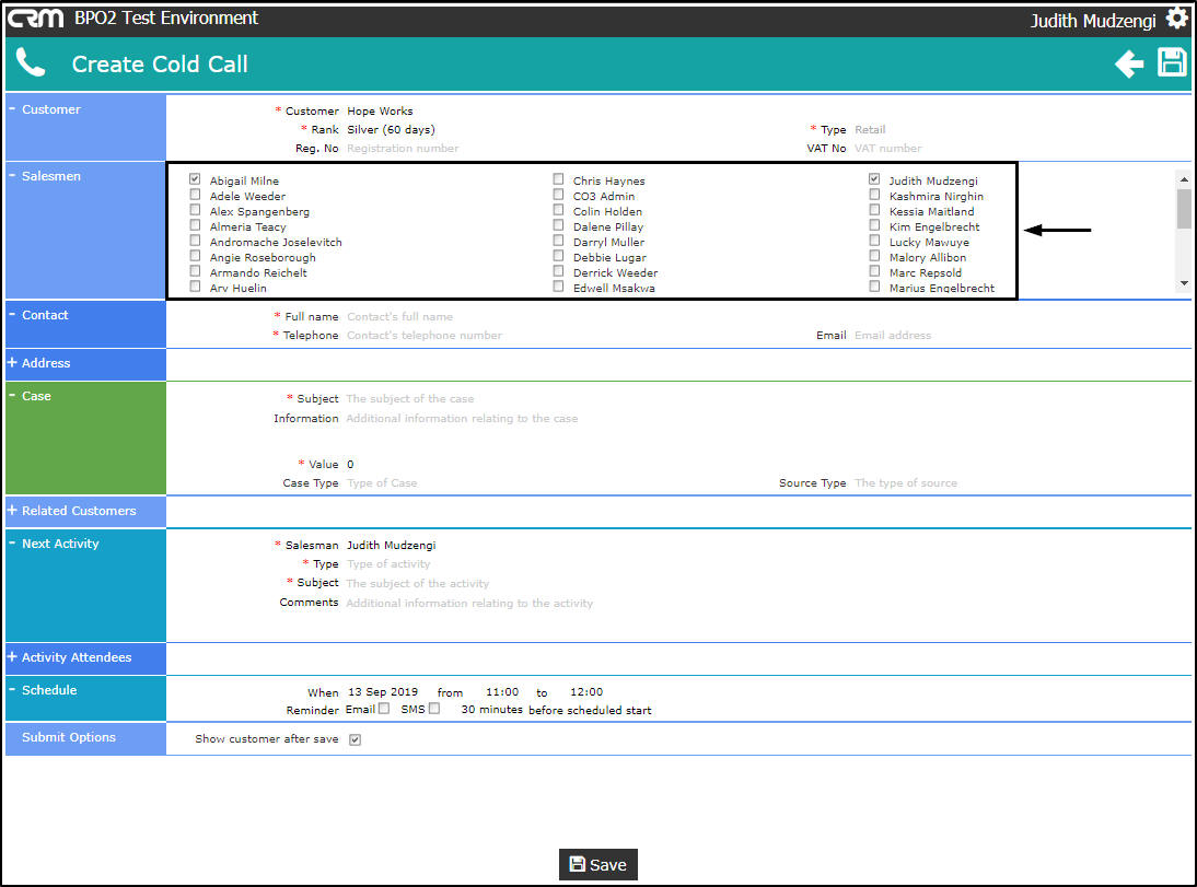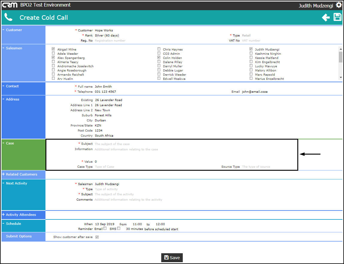 - Salesmen: You will be selected by default. You can assign this Customer, Case and Activity to another salesman, if you are raising this on their behalf.