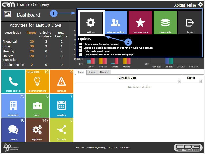 - Click on the Settings icon or the CRM logo to return to the Dashboard (Home page).
