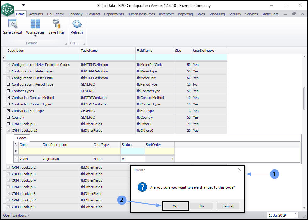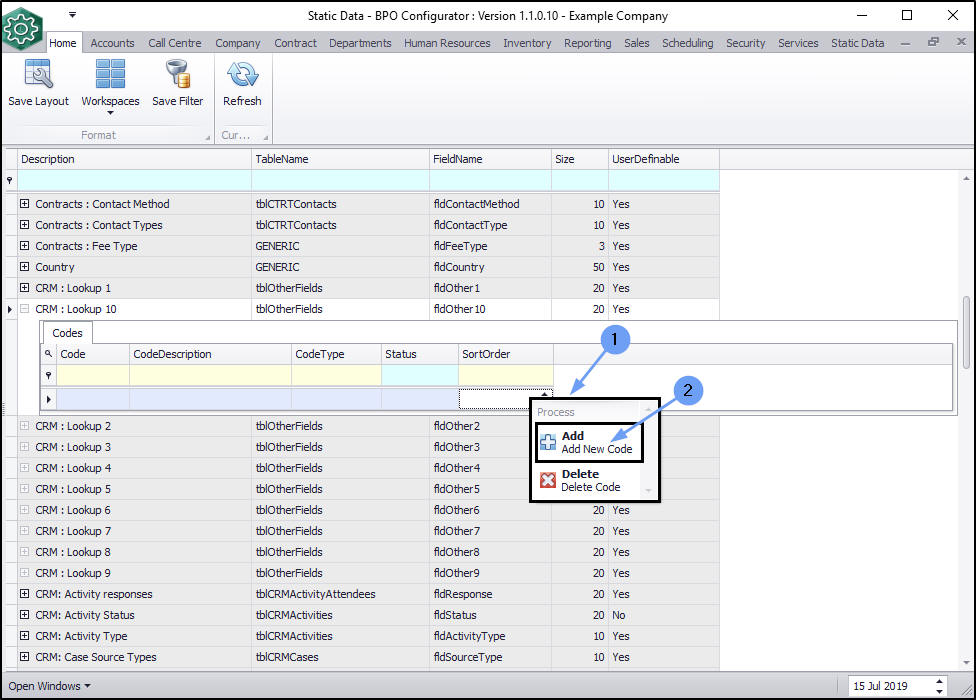 - The new CRM Lookup field code will be saved and a new row will be added to the Codes data grid.