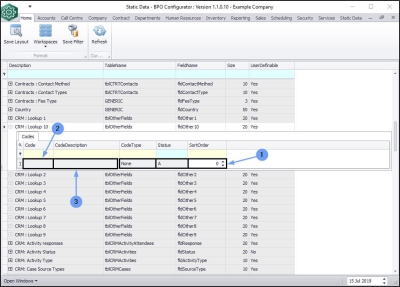 - The blank row in the Codes data grid will now be activated - the Code Type, Status and Sort Order columns will now be populated.