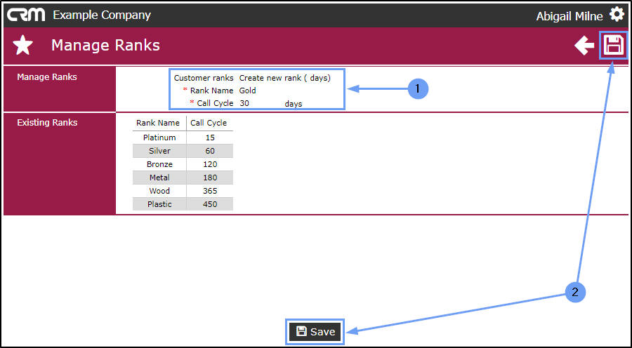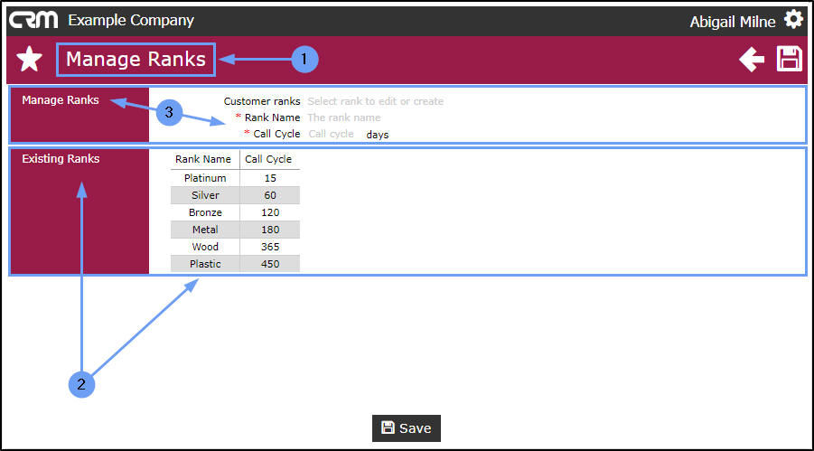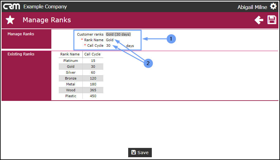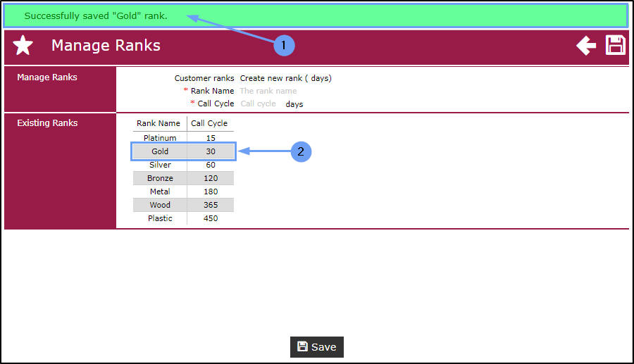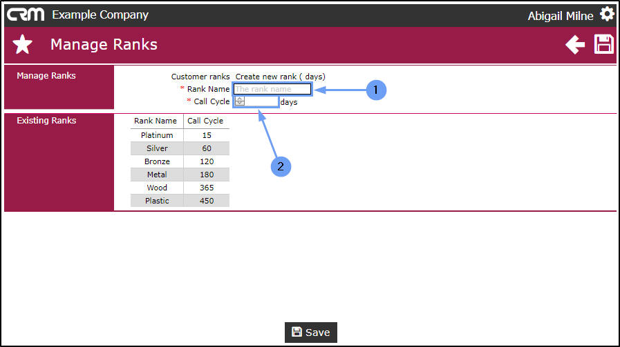Rank is based on how much you value a customer and helps to define the call cycle per client. For example, a Wood ranking indicates that you will only contact this customer every 365 days - this customer is not valuable to you. However a Platinum ranking indicates that this is a very important customer that you wish to maintain a good relationship with, therefore you will contact them every 15 days.