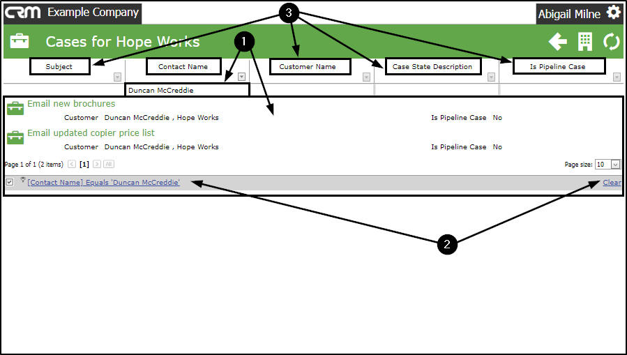 - The filter row will display the filter sequence. You can click on Clear to remove any filter(s). The page will then display all the Cases linked to the customer again.