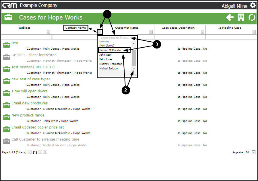 - In this example, the selected filter arrow is in the Contact Name column, therefore the menu displayed will list all the contact names linked to your cases.