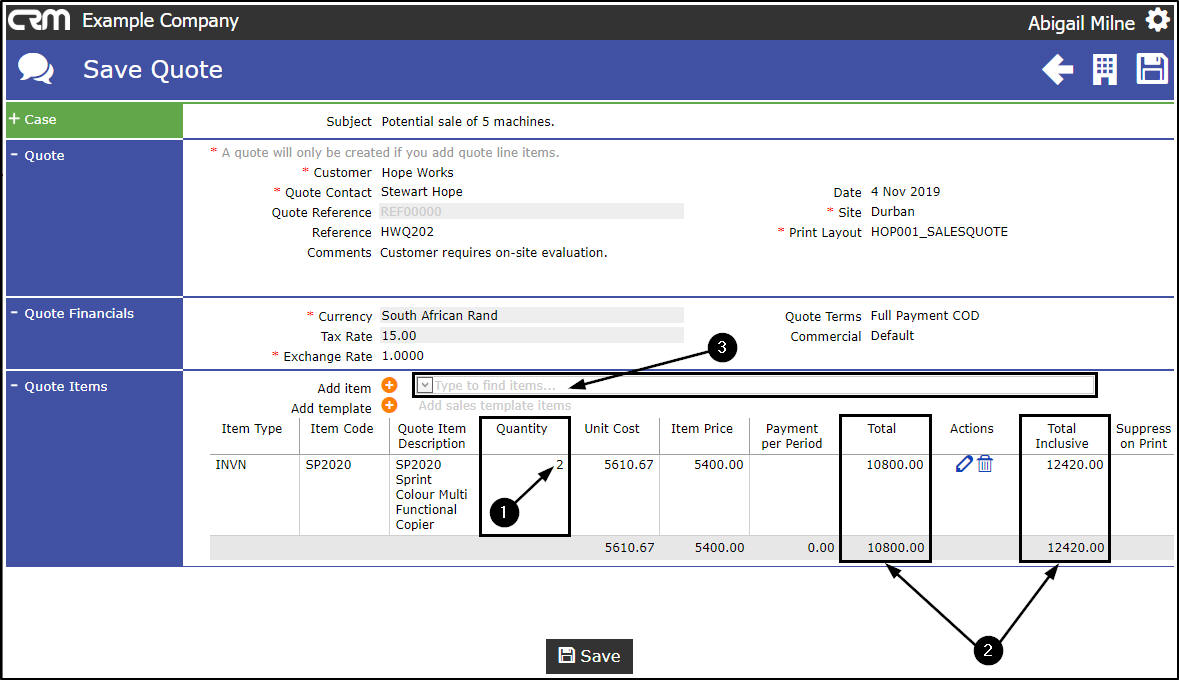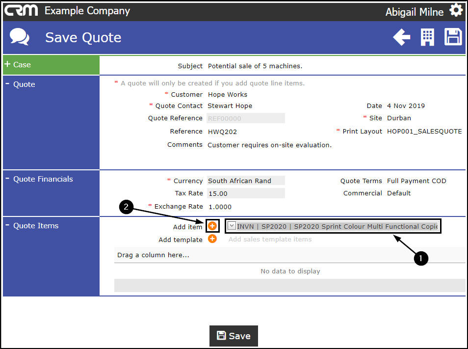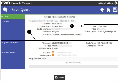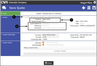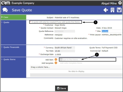 - Take note of the message at the top of the Quote section: you must add at least one item to this quote for it to be created. This process is set out below.