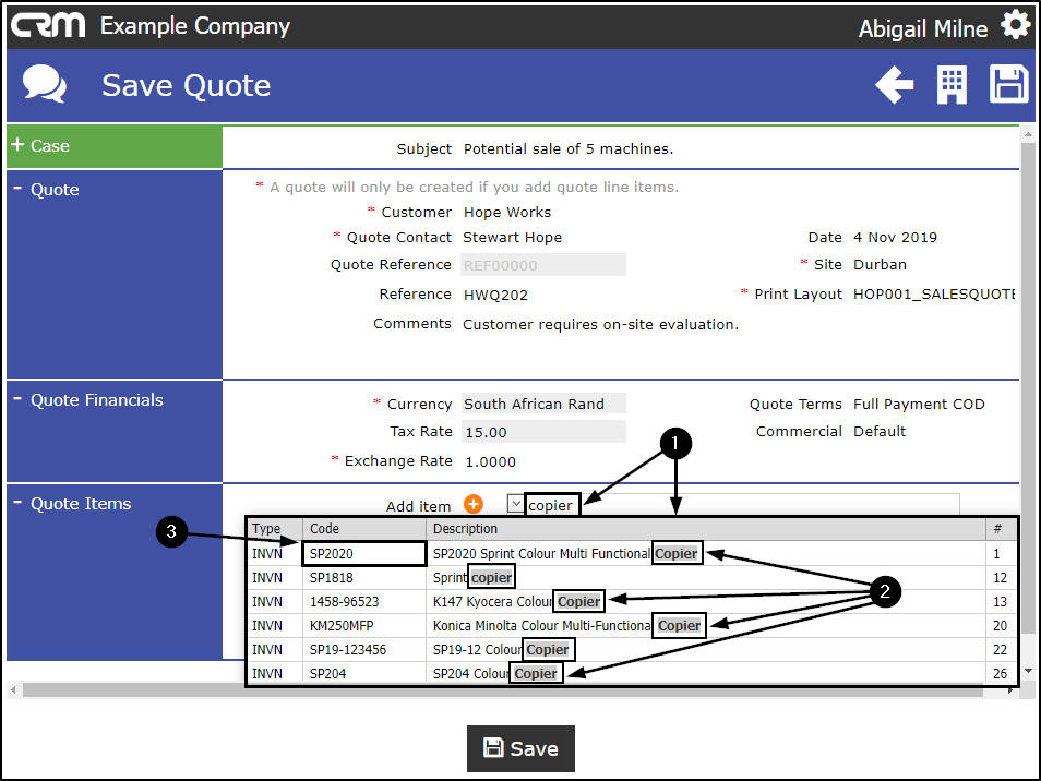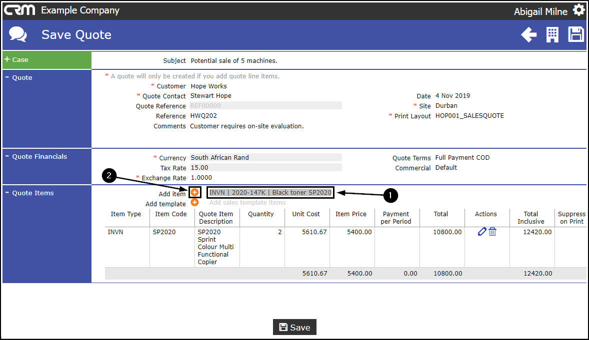 - In the Add item field, start typing the code or description of the next item that you wish to add to the quote.