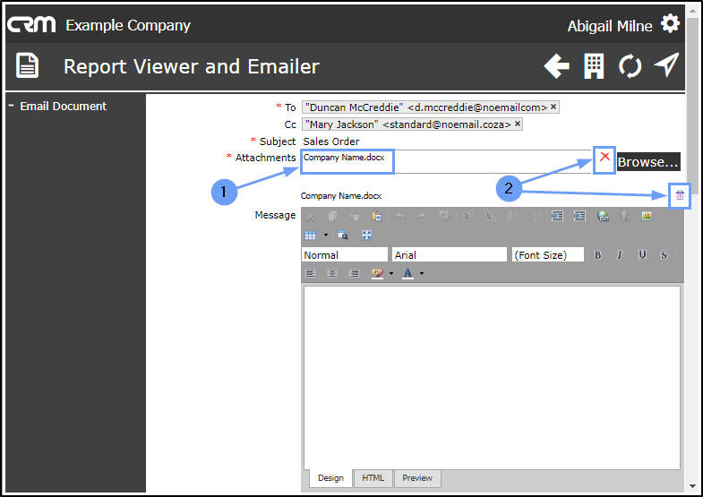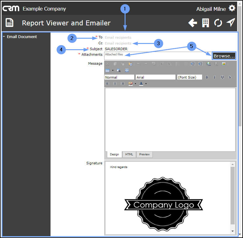 - Signature: If you have a Signature configured in CRM - your Signature will pull through here, otherwise the Company default CRM mail signature will pull through.