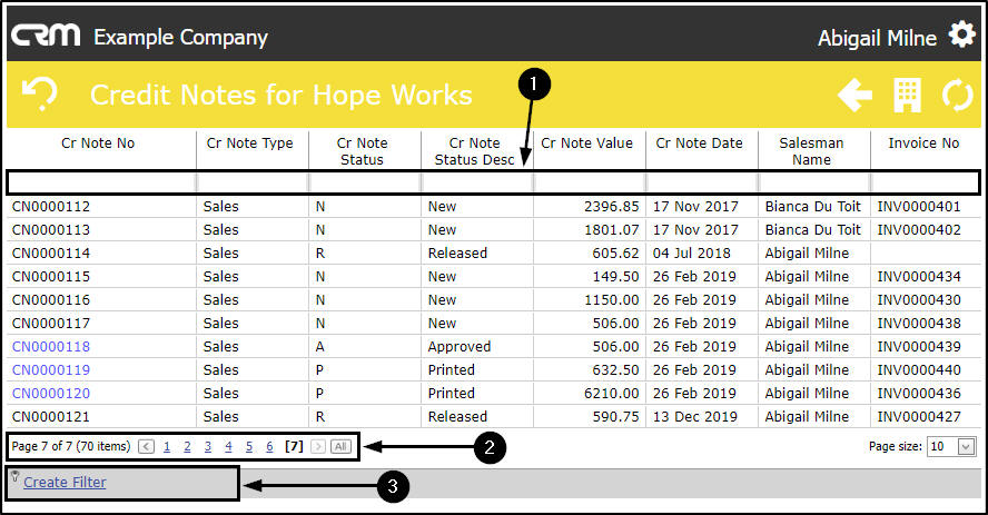 - the Create Filter row to search for a specific Credit Note.