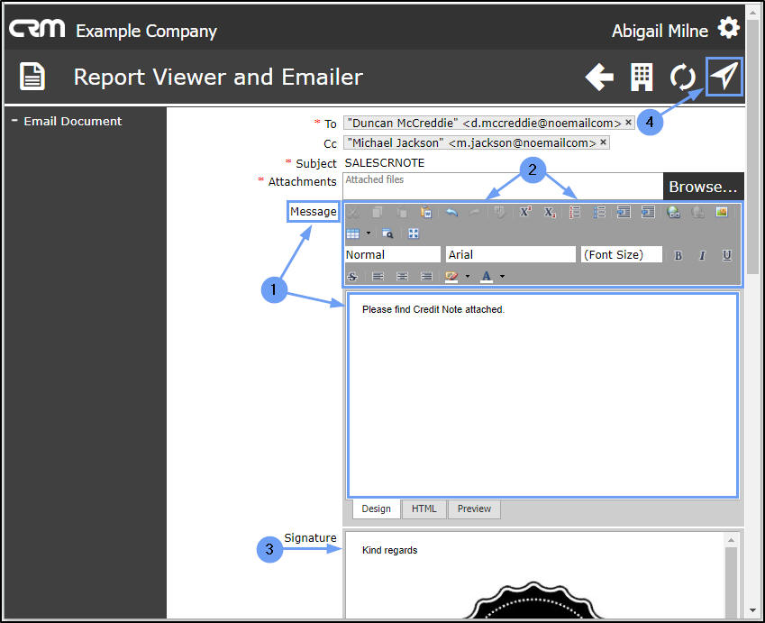 - Signature: If you have a Signature configured in CRM - your Signature will pull through here, otherwise the Company default CRM mail signature will pull through.