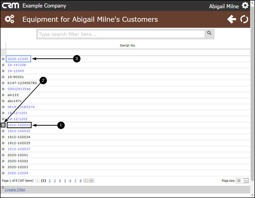 In CRM, you can view serialised equipment items for the customer in 2 different screens: