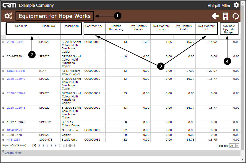 - The Contract Details linked to each serialised equipment item, if applicable.