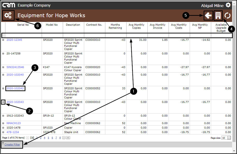 - Us the scroll bar, the Create Filter row or the Filter Box to search for the specific serial number that you wish to view the contract details of.