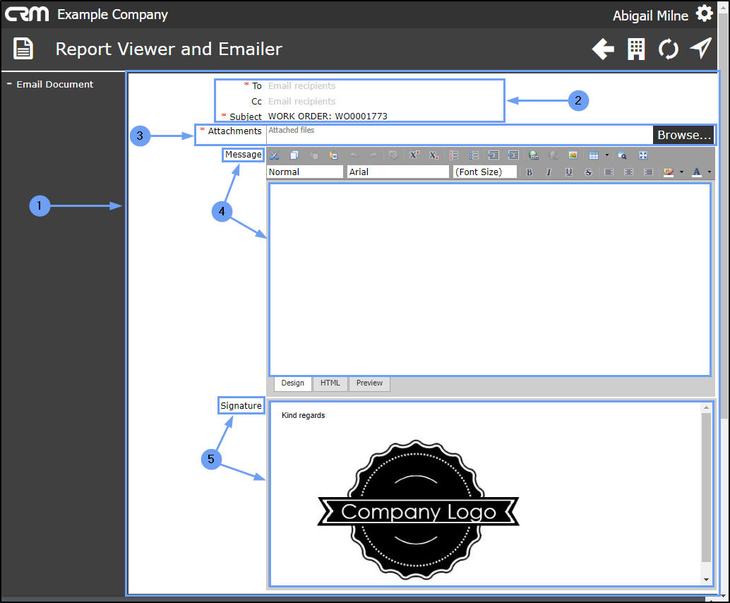 - Signature: This will contain either the default Email Signature or the customised Email Signature depending on what has been set up in your CRM.