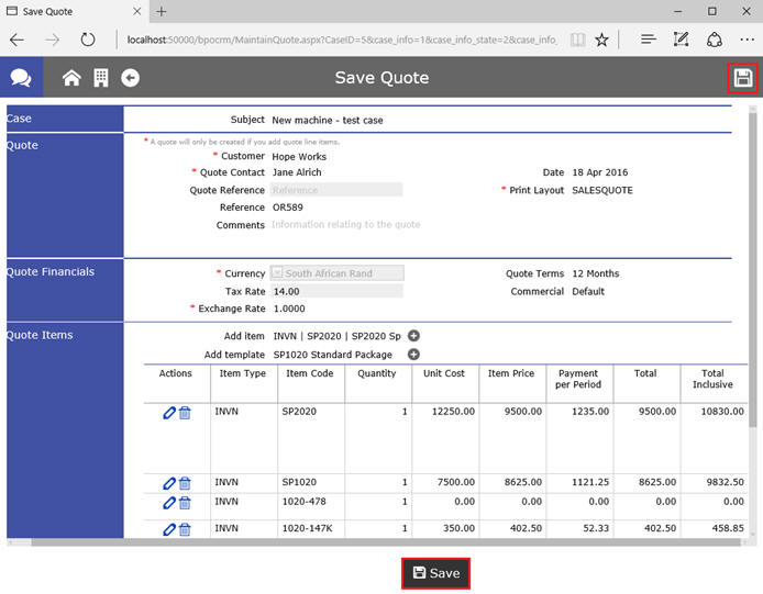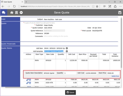 - The Quote, Quote Financials, Add Quote Items and Quote Items frames will be expanded.