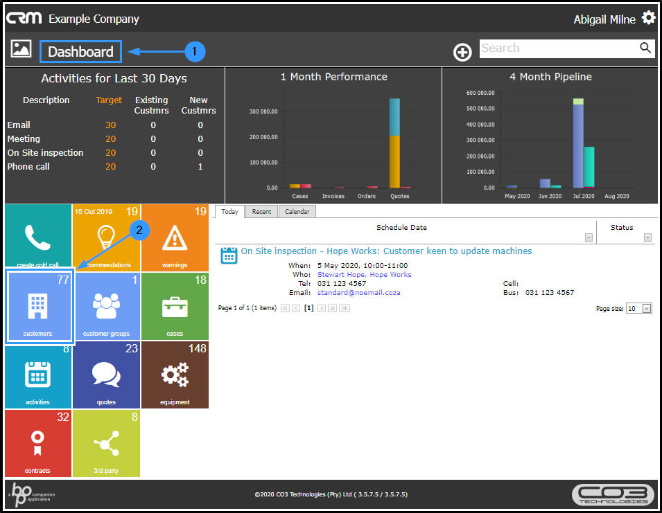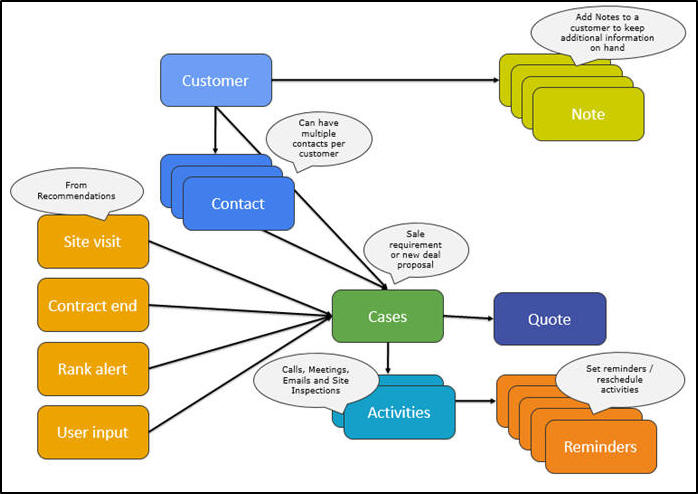 - CRM is designed with the Salesman in mind. All information viewed is specific to the user that is logged in. This user, sees only his / her Customers, Cases, Activities, Pipeline, etc. and can plan accordingly.