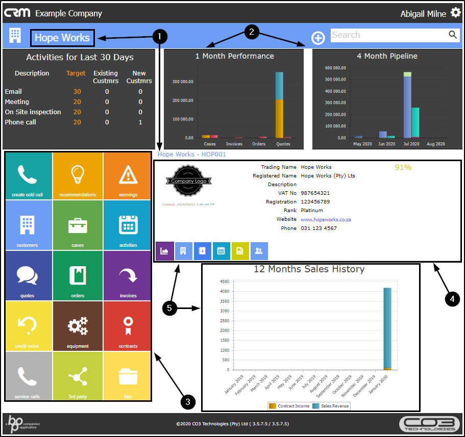 - The lower, left side of this page contains tiles which will direct you to a Customer-specific list of information. For example, the Activities tile will direct the salesman to a list of all the activities for the selected customer that are linked to him on the system.