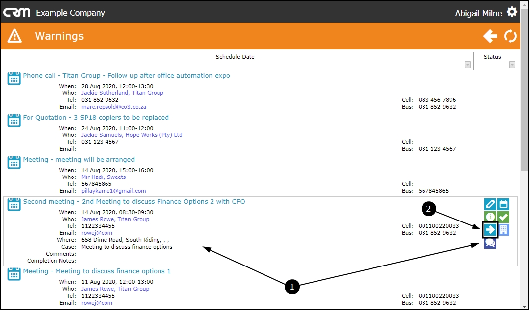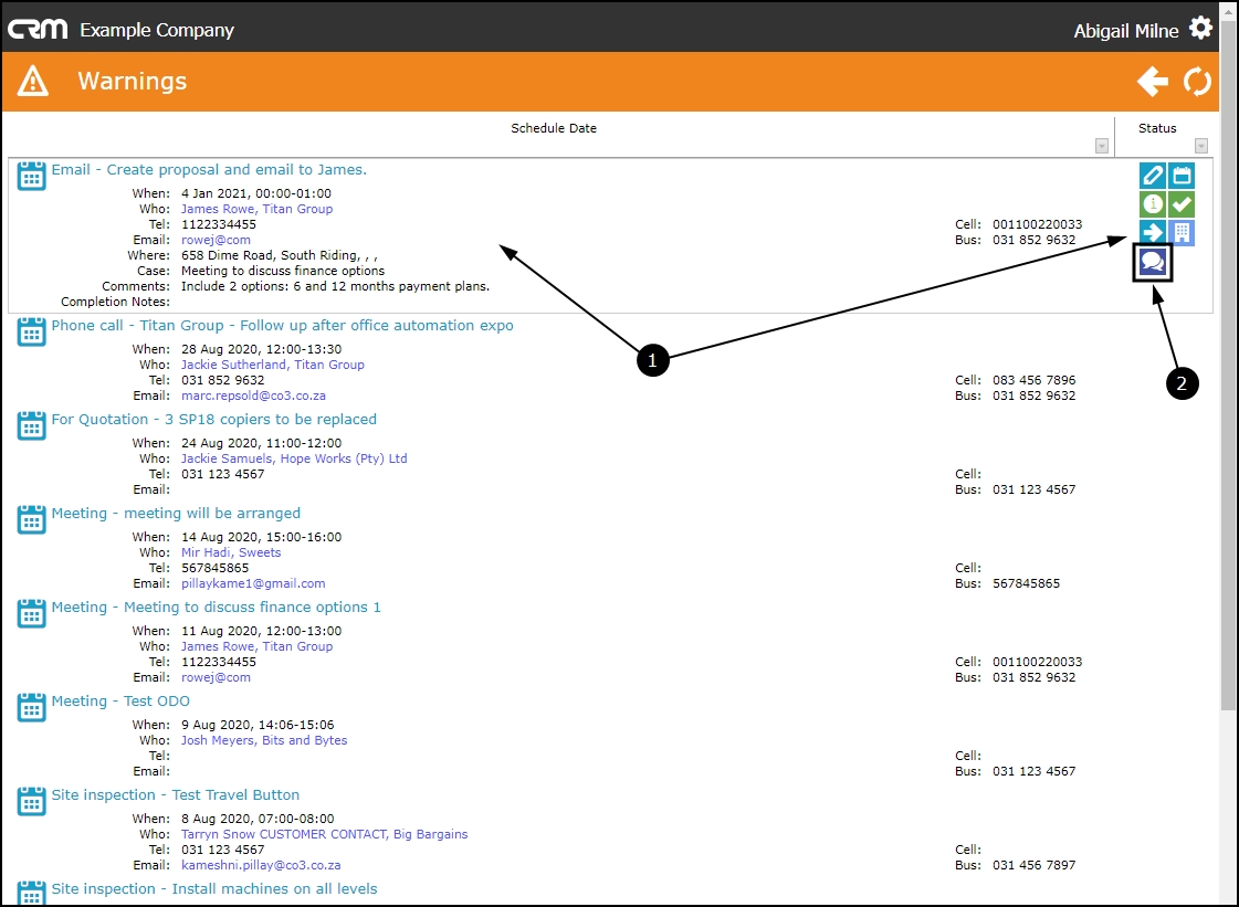 Warnings are notifications of overdue activities, that can be directly actioned from the Warnings page using the Activity Action buttons.