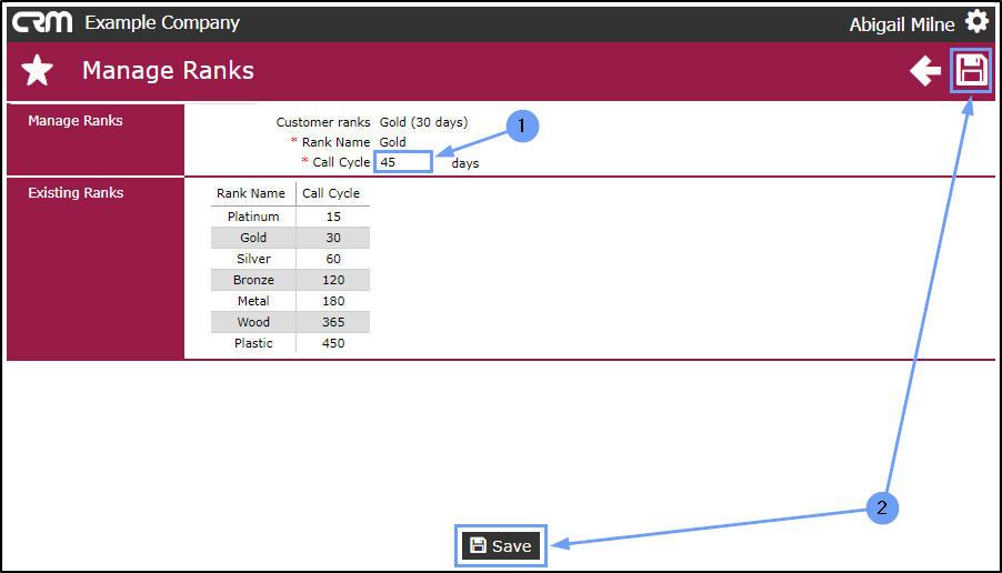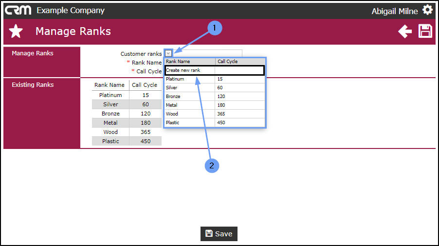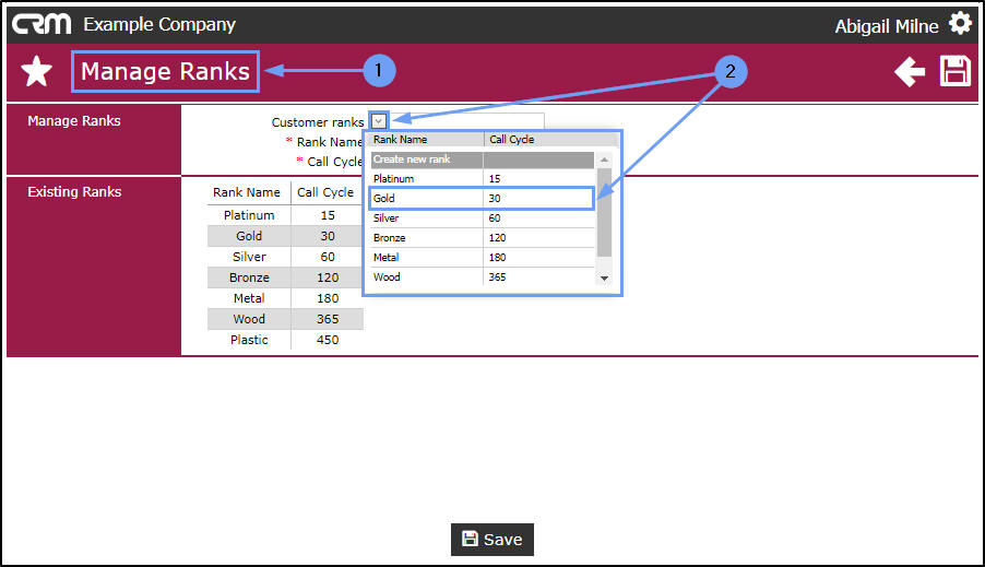 Rank is based on how much you value a customer and helps to define the call cycle per client. For example, a Wood ranking indicates that you will only contact this customer every 365 days - this customer is not valuable to you. However a Platinum ranking indicates that this is a very important customer that you wish to maintain a good relationship with, therefore you will contact them every 15 days.
