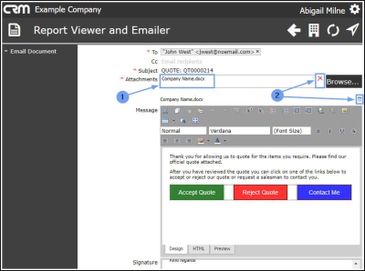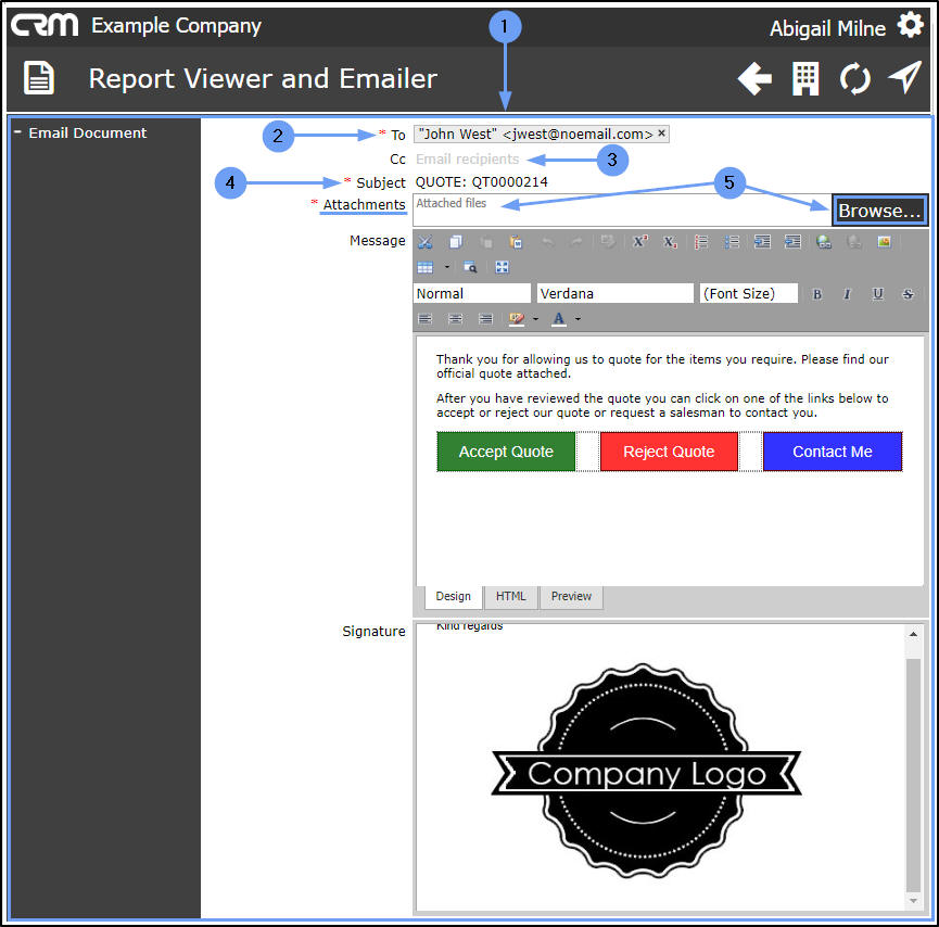 - To: This will auto populate with the CRM contact for the Quote (case) but you can change this, if required.