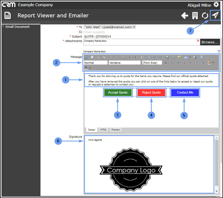 - Subject: This field will auto populate with the selected Quote number but you can edit this, if required.